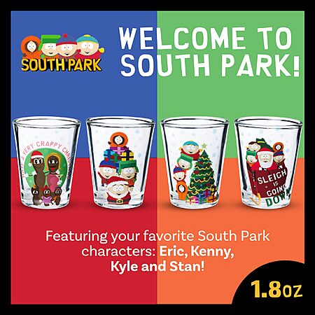 - FESTIVE DESIGN SET: Includes four 1.5oz mini glasses featuring South Park characters in Christmas-themed group scenes crafted from clear glass with vibrant artwork for fans of irreverent holiday fun.