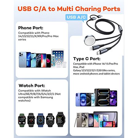 Product Description from Amazon:- 3 in 2 Multi Charging Cable: Includes a 4 ft 3 in 2 charging cable that features USB C/USB A input ports and three output ports: Type-C, Phone port and watch port. The multi charger cable is compatible with both USB C and USB A chargers, making it a versatile option for various devices