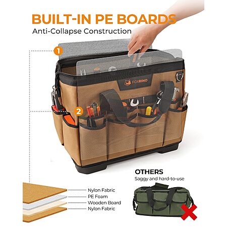 Foxrino Heavy Duty 16" Anti-Collapse Tool Bag w/ 42-Pocket Organization $31.99