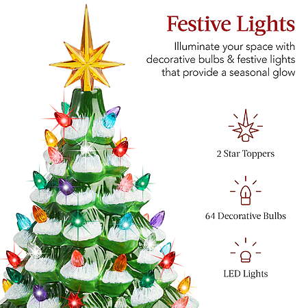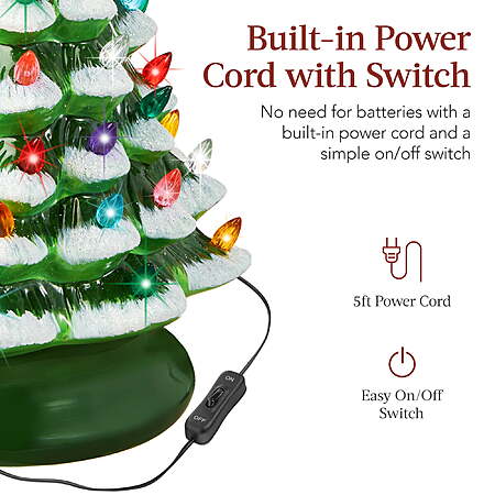 | Product Description: | Add a touch of sparkle to your holiday decor with a charming tabletop accent. Our 15in Hand-Painted Ceramic Tree shines with glowing lights to fill your space with cheer, while the glossy finish highlights its hand-painted details. Made from durable ceramic, it's timeless, easy to clean, and ready to spread holiday joy in the office, on your coffee table, in the living room, and more! HAND-PAINTED FINISH: This mini ceramic Christmas tree is the perfect addition to your holiday decor, beautifully hand-painted with a glossy finish LIGHTS & STAR DECORATION: Decorated with 64 festive White, Multicolor, Red and White, or 2-in-1 White and Multicolor light bulbs and two 7 pointed star toppers to brighten up your holidays (Note: SKY3037 comes with one star topper) 5FT POWER CORD: No need for batteries with the built-in 5-foot power cord and simple on/off switch COMPACT SIZE: Perfectly sized, small enough to fit on any countertop, table, desk, or fireplace mantel VERSATILE DECOR: Ideal for decorating homes, offices, or even classrooms with a little holiday cheer; OVERALL DIMENSIONS: 8.5"(Dia) x 15"(H) |