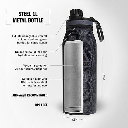 $16.31*:adidas 1 Liter (32 oz) Metal Water Bottle, Hot/Cold Double-Walled Insulated 18/8 Stainless Steel, Twill Black/Black/Grey Five, 32 Ounces