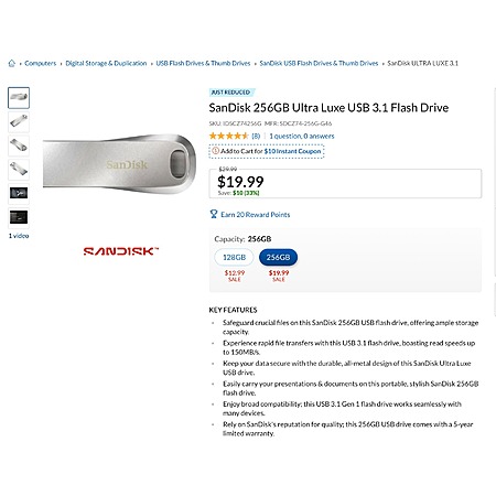 SanDisk 256GB Ultra Luxe USB 3.1 Flash Drive $9.99