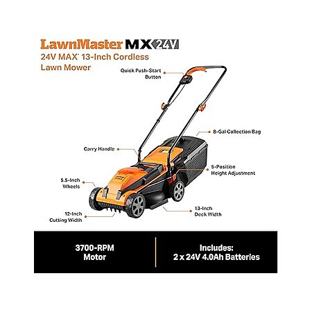 - [INCLUDED]13-inch 24V cordless lawn mower, 2x24V MAX* 4.0Ah batteries.