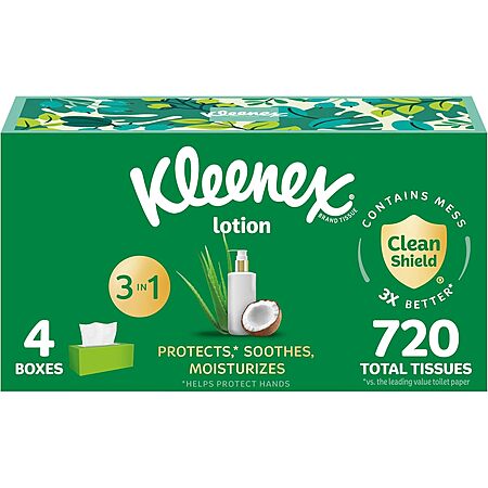 4-Pack 180-Count Kleenex Lotion 3-Ply Facial Tissues w/ Coconut Oil & Aloe