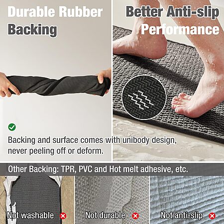 • Upgraded Non-Slip Backing: Our bathroom mats feature natural rubber backing, increasing slip resistance of a floor surface. They tightly grip smooth surfaces without skidding, and hence prevent and reduce the risk of falls for kids and the elderly. Say goodbye to slippery PVC/TPR bathroom mat—step out safely with our secure, stable design