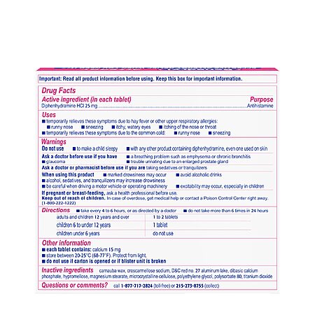 - Get powerful relief from unexpected allergies with Benadryl Allergy Ultratabs Antihistamine Allergy Relief Tablets; that offer effective cold & allergy relief from hay fever, upper respiratory allergy & common cold symptoms in one small, oval shaped coated tablet. Each easy-to-swallow tablet contains 25 milligrams of the antihistamine diphenhydramine HCl to temporarily relieve allergy symptoms due to hay fever & upper respiratory allergies like sneezing; runny nose; itchy throat & nose; & itchy,