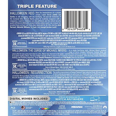 Halloween H20: 20 years ago, evil escaped incarceration in the form of Michael Myers, leading to a bloody killing spree on Halloween. Now, Michael has returned to terrorize a new generation, starting with original final-girl Laurie Strode (Jamie Lee Curtis). Halloween Resurrection: A group of college students win a contest to spend the night in the childhood home of brutal serial killer Michael Myers. They expect a few scares but none of them are prepared for what awaits them in this frightening follow-up to HALLOWEEN H20. Jamie Lee Curtis returns as Laurie Strode, heart set on stopping the masked maniac. Director Rick Rosenthal (HALLOWEEN II) returns to the franchise with this unique installment in the HALLOWEEN universe. Halloween The Curse of Michael Myers: The town of Haddonfield, Illinois, celebrates Halloween for the first time in five years, only to be joined in the festivities by maniacal mass murderer Michael Myers, with his nemesis, the inveterate psychiatrist Dr. Loomis, hot on his heels.