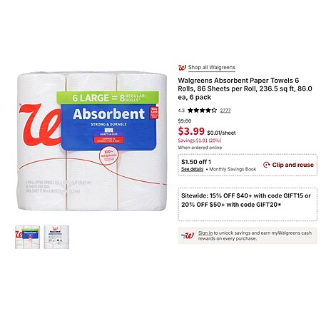 Walgreens Absorbent Paper Towels 6 Rolls, 86 Sheets per Roll, 236.5 sq ft, 86.0 ea, 6 pack
