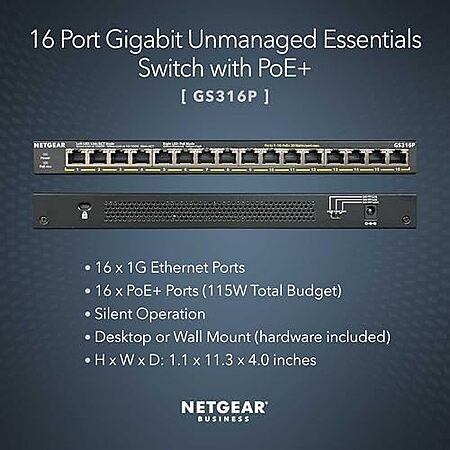 $69.99*: NETGEAR 16-Port PoE+ Gigabit Ethernet Unmanaged Essentials Switch (GS316P) at Amazon