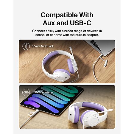 amazon.com has Belkin SoundForm Inspire Wired Over-Ear Headset for Kids, Online Learning & Travel w/Built-in Boom Mic, 85dB Safe Volume Limit - USB-C & 3.5mm - Compatible w/iPhone, iPad, Galaxy & More - Lavender on sale for $21.69. Shipping is free with Amazon Prime or on orders $35+.