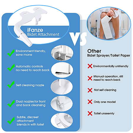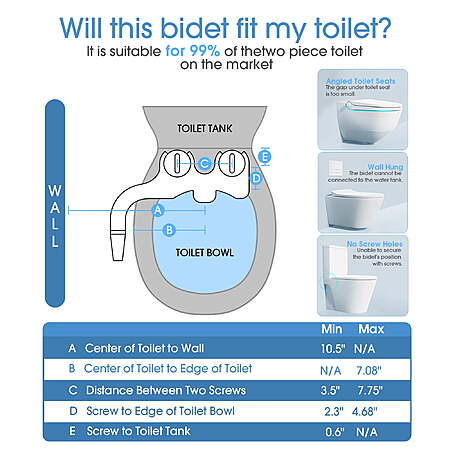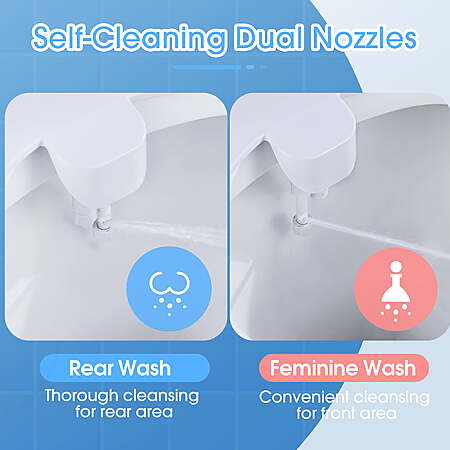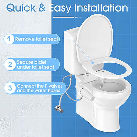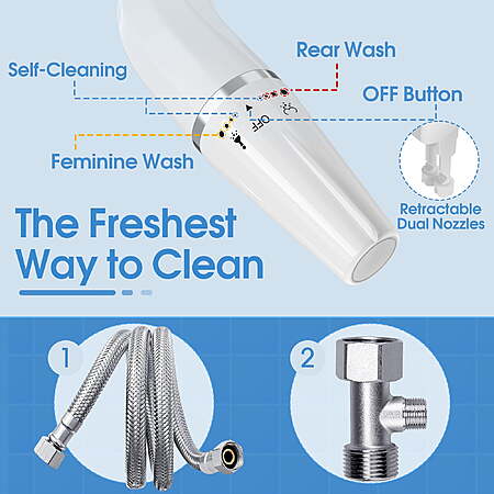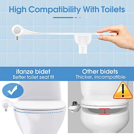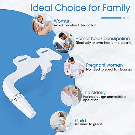 | Product Description: | Two Wash Modes: The rear wash has a strong flow towards the back, and the feminine wash provides a gentler flow towards the front. The feminine wash is particularly useful during monthly cycles and for new or expecting mothers. Premium Quality: The Qunler Bidet is made of durable White ABS Material, with a One-piece design control panel, high-pressure quality valves, brass T-adapter, and a braided steel cold water hose for durability. Highly Hygienic Protection: The self-cleaning feature thoroughly cleans the nozzles, and they retract behind the guard gate for maximum protection and easy maintenance. Ultra-Slim and Compatible: The bidet sprayer is only a quarter-inch thick, providing support, maintaining the toilet seat level, and fitting comfortably with standard toilets. Size: 15"*6", Assembled Product Length: 15". Adjustable Water Pressure: The water-pressure control knob allows you to adjust the water pressure for a comfortable experience. It's suitable for all ages, including the elderly and children. Some Useful Q&A: Q: Why isn't the cover tightly closed? A: Please confirm whether your toilet belongs to the following types, such as: Long One-Piece, One-Piece and Two-Piece. Q: Why doesn't the bidet spray water? A: There are 2 reasons for the issue. 1.Low inlet water pressure: Nozzle rod does not work properly. Solution: Please ensure that the water pressure is normal, please check your home pipe system. 2.The direction of the check valve is installed in the opposite direction, causing the water flow can not be normal through the product. Solution: Please check valve directions. Size: 15" * 6" Spray Nozzles: Qunler Bidet attachment features nozzles for two spray modes: front cleaning for women's private, rear cleaning for men & women. Easy Installation: Simple and detailed installation instructions are provided. It can be easily installed in minutes without the need for a plumber. Easy Home Upgrade: Transform your home with a white Bidet in seconds, adding a touch of luxury to your bathroom. Sanitary Protection: Self-cleaning feature sanitizes the nozzles thoroughly, telescopic nozzles automatically retract behind the convenient & movable guard gate for maximum protection and easy maintenance, give you double sanitary guarantee. What's in the Box? Includes 1 Bidet, 1 stainless steel braided hose (24.8 inches), 1 stainless steel T-adapter, 1 Teflon tape, and installation instructions. Size: 15"*6" Recommended Use: Toilet |