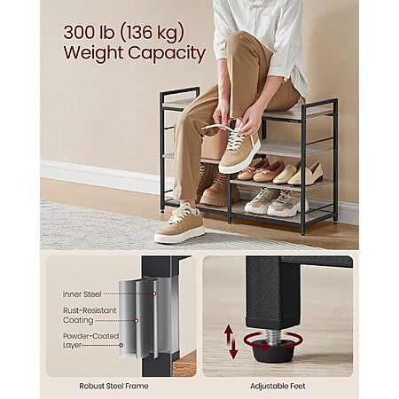 - 【STURDY, SECURE, STABLE】Made of robust steel and thick particleboard, this bench supports up to 300 lb, with each shelf holding up to 11 lb. Guard rails prevent items from falling off the top, and adjustable feet ensure stability on uneven floors