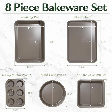 • ALL-IN-ONE BAKING ESSENTIALS SET: Includes two 8-Inch round cake pans, two 8-Inch square cake pans, two 6-cup muffin or cupcake pans, one 17 x 12-Inch cookie sheet and one 17 x 12-Inch roasting pan.