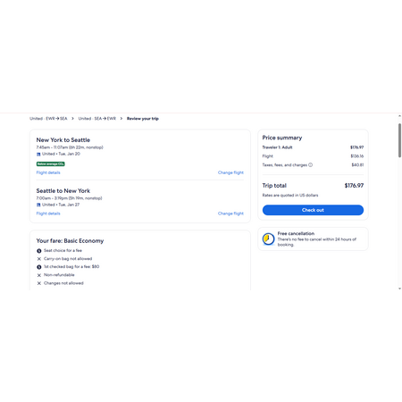 United Airlines have round trip airfares travelling to and from New Jersey (EWR) and Seattle (SEA) for $177, nonstop. These are basic economy fares that only allow a personal item. There is no seat selection, no carry-on bag and no change. If you are travelling with children, you will be seated together as per their policy.