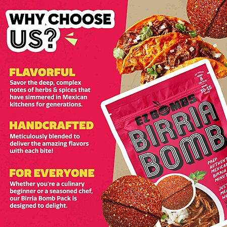 - HANDCRAFTED WITH QUALITY INGREDIENTS - Made with authentic, premium spices and herbs, our Birria Bomb Pack delivers a balanced, bold taste that won't overpower. Enjoy the deep, comforting flavors of traditional Mexican birria, making restaurant-quality meals accessible to everyone.