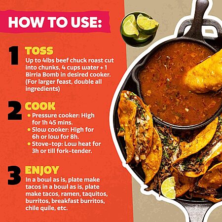 - VERSATILE INGREDIENT - From tacos to burritos, nachos to quesadillas, the Birria Bomb enhances all your favorite dishes. It's your all-in-one secret ingredient for a variety of delicious Mexican meals, easily adapted for stovetop, slow cooker, or pressure cooker preparation.