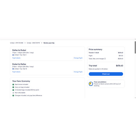 United Airlines and Expedia have round trip airfares travelling from Dallas (DFW) to Dubai UAE (DXB) for $677, making 1 or 2 stops both ways, depending on the flight you choose. My screen shot shows 1 stop both ways. These are main cabin, regular economy fares that allow a personal item, a carry-on bag, 2 free checked bags seat selection and free change (plus fare difference, if any).