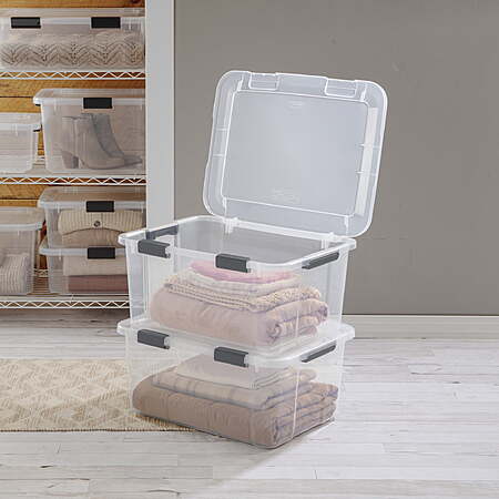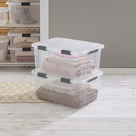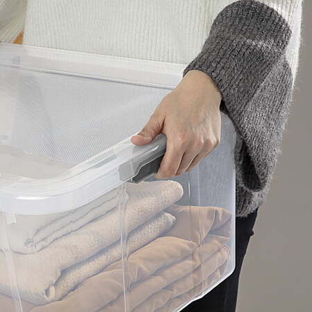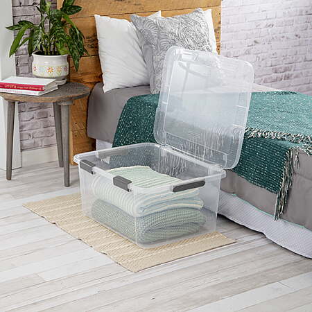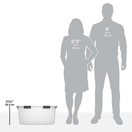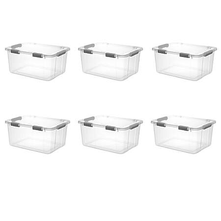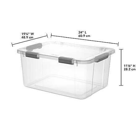 | Product Description: | Great organization “hinges” on the ideal solution for your storage challenge!… And here is a brand new Clear Storage option! The HingeLID Storage Box line combines popular features such as a hinged lid for easy access, clear lid and base for quick identification of contents, and a stylish textured pattern for a décor touch! The innovative hinged lid stays open unassisted, allowing you to use both hands, for careful handling of stored items. The lid stays attached, so no worry of it getting misplaced! For easy clean up, snap the color-accented latches to secure the lid to the base and transport the Storage Box with ease using the textured, comfort-grip handles. The 60 Quart HingeLID Storage Box is ideal for sorting and storing items such as off season clothing, sporting equipment, boots, blankets and other bulky items around the home. Once your items are stored, the clear lid and base allows for easy viewing and retrieval of your belongings. The 40 Qt, 60 Qt and 80 Qt HingeLID Storage Boxes use the same lid, allowing shallow and deep sizes to be stacked on the same footprint. The indexed lids allow for secure stacking and efficient use of that vertical storage space. The HingeLID Storage Box line is available in five sizes, ranging from 20 Qt to 80 Qt, and designed with a modern profile and textured pattern. Pick up the sizes that are best for you and dress up your storage today! The overall assembled dimensions of this item are 24" L x 19 1/4" W x 11 1/8" H. Sterilite 60 Quart HingeLID Storage Box, Dark Gray, 6 Count Outside Dimensions: 24" x 19 1/4" x 11 1/8" Interior Dimensions at bottom: 20 3/8" x 15" x 10 3/4" Versatile, all-purpose solution, ideal for a variety of household storage needs Hinged lid allows for easy access to contents and ensures that the cover is never misplaced Clear lid and base allow for contents to be viewed at a glance and easy to find Sturdy, color-accented latches secure lid to base, keeping contents safely stored inside Modern, decorative and textured pattern featured throughout the item – on the lid, latch and handles Comfortable handles make lifting and transporting easy BPA-free and phthalate-free |