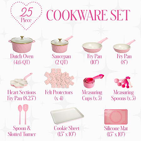 | Product Description: | Transform your kitchen into a glam culinary playground with the Paris Hilton 25-Piece Diamond-Faceted Cookware & Bakeware Set. Featuring a mix of essential cookware, bakeware, and tools, this set has everything you need to cook, bake, and serve in iconic Paris style. The set includes: 8" fry pan, 10" fry pan, 2-quart saucepan with lid, 4.6-quart Dutch oven with lid, 8.25" 4-section heart pan, Spoon, Slotted turner, 10-piece measuring set, 4 felt pan protectors, Medium 15” x 10” baking sheet (oven safe up to 425°F), 15” x 10” baking mat (oven safe up to 425°F). Crafted from cast aluminum with a chic diamond-faceted exterior, this cookware heats quickly and evenly for better cooking results. The Clean Ceramic™ nonstick coating ensures easy food release and quick cleanup, so your recipes look as good as they taste. Cookware is dishwasher safe, though hand washing is recommended to keep the finish looking flawless. The baking mat and sheet add extra versatility, making it easy to go from stovetop to oven. Suitable for gas, electric, and glass cooktops (not induction). Make every meal a moment with this Paris Hilton all-in-one cookware set—because your kitchen deserves to sliv too. ICONIC 25-PIECE SET: Includes 8" & 10" fry pans, 2QT saucepan with lid, 4.6QT Dutch oven with lid, 8.25"" 4-section heart pan, spoon, slotted turner, 10-piece measuring set, 4 felt pan protectors, medium 15”x10” baking sheet, and 15”x10” baking mat—a complete kitchen in one box. DIAMOND-FACETED DESIGN: Cookware features a chic diamond-faceted exterior in signature Paris Pink for a stylish, standout look. HEART-SHAPED KNOBS: Tempered glass lids feature shiny gold heart knobs, adding a touch of glam to your kitchen. CLEAN CERAMIC™ NONSTICK COATING: Designed for easy food release and quick cleanup, so meals glide out beautifully with minimal oil or butter. FAST, EVEN HEATING: Cast aluminum construction ensures quick, consistent heating across all pieces. Safe for gas, electric, and glass stovetops (not induction). OVEN SAFE PERFORMANCE: Baking sheet and baking mat are oven safe up to 425°F, giving you versatility for cookies, roasted veggies, and more. DISHWASHER SAFE COOKWARE: Cookware is dishwasher safe for easy cleanup, though hand washing is recommended to preserve the finish. #BeAnIcon: Post your kitchen creations with #BeAnIcon for a chance to be featured on Paris’ social media! |