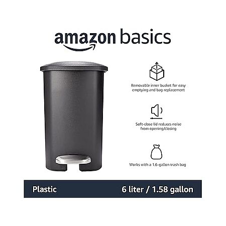 woot! has Amazon Basics Compact Plastic Bathroom Trash Can with Hands Free Foot Pedal, Quiet Close Step-On, 6 Liters, Black, Lid Included on sale for $12.99. Shipping is free w/ Prime. Otherwise shipping is $6.