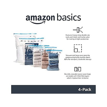 Woot! has Amazon Basics Vacuum Compression Space Saving Storage Bags with Hand Pump for Clothes Packing, Ideal for Blankets, X-Jumbo Pack of 4 on sale for $8.99. Shipping is free w/ Prime. Otherwise shipping is $6.