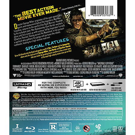 | Product Description: | Mad Max: Fury Road - A woman rebels against a tyrannical ruler in post apocalyptic Australia in search for her home-land with the help of a group of female prisoners, a psychotic worshipper, and a drifter named Max. Mad Max: Fury Road is a 2015 action film directed and produced by George Miller, and written by Miller, Brendan McCarthy and Nico Lathouris. The fourth installment in the Mad Max franchise, it is an Australian and American[6] venture produced by Kennedy Miller Mitchell, RatPac-Dune Entertainment and Village Roadshow Pictures. The film is set in a future desert wasteland where gasoline and water are scarce commodities. It follows Max Rockatansky (Tom Hardy), who joins forces with Imperator Furiosa (Charlize Theron) to flee from cult leader Immortan Joe (Hugh Keays-Byrne) and his army in an armored tanker truck, which leads to a lengthy road battle. The film also features Nicholas Hoult, Rosie Huntington-Whiteley, Riley Keough, Zoë Kravitz, Abbey Lee, and Courtney Eaton. Fury Road was in development hell for many years, with pre-production starting as early as 1997. Attempts were made to shoot the film in 2001 and 2003, but were delayed due to the September 11 attacks and the Iraq War. In 2007, after focusing on Happy Feet, Miller decided to pursue producing the film again. He briefly considered producing it as a computer-animated film but abandoned it in favor of live-action. In 2009, Miller announced that filming would begin in early 2011. Hardy was cast as Max in June 2010, with production planned to begin that November. Principal photography was delayed several more times before beginning in July 2012. The film wrapped in December 2012, although additional footage was shot in November 2013. The film had it's world premiere on 7 May 2015 at the TCL Chinese Theatre. It began a worldwide theatrical release on 14 May 2015, including an out-of-competition screening at the 68th Cannes Film Festival, in 2D, 3D, IMAX 3D and 4DX. It has grossed over $377 million worldwide, making it the highest grossing film in the Mad Max franchise. The film was widely acclaimed for it's acting, direction, screenplay, art direction, score, practical effects, stunts and action sequences, and is considered the best film of 2015 by many critics and publications as well as one of the greatest action films of all time. Fury Road won many critical and guild awards, and received ten Academy Award nominations, including Best Picture and Best Director, the second most-nominated film of the 88th Academy Awards. It is the first film of the Mad Max franchise to receive Academy Award recognition and one of the few sequels to be nominated for Best Picture. It won six Academy Awards for Best Costume Design, Best Production Design, Best Makeup and Hairstyling, Best Film Editing, Best Sound Editing, and Best Sound Mixing, more than any other film that year. Mad Max: Fury Road (4K Ultra HD + Blu-ray) Action R 4K Ultra HD Warner Bros. Includes Limited Time Digital Movie Offer. MUST ENTER REDEMPTION CODE BY 12/31/2019 TO REDEEM DIGITAL MOVIE OFFER. |