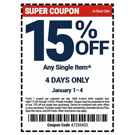 From January 1 - 4, Harbor Freight will offer 15% off any item when you present applicable coupon, in store only.
