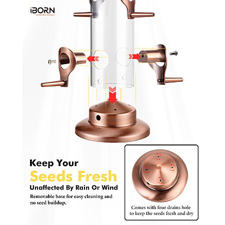 iBorn-Direct via Amazon.com has iBorn Metal Bird Feeders Brushed Copper Wild Bird Feeder for Outdoors Hanging All Metal Brushed Copper Finishing 14 Inch 6 Port(Seed is not Included) on sale for $14.81. Shipping is free with Prime or on $35+ orders.