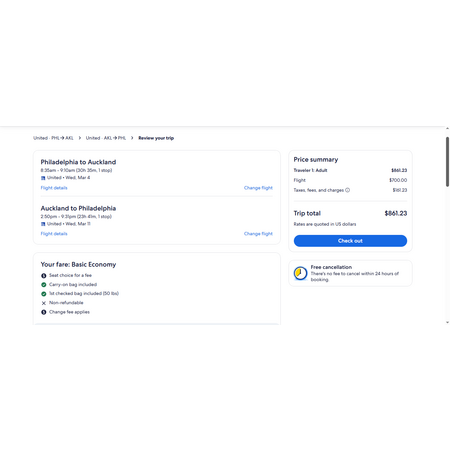 United Airlines and Expedia have round trip airfares travelling from Philadelphia (PHL) to Auckland New Zealand (AKL) for $862, making 1 stop. These are basic economy fares that allow a personal item, a carry-on bag and 1 free checked bag.