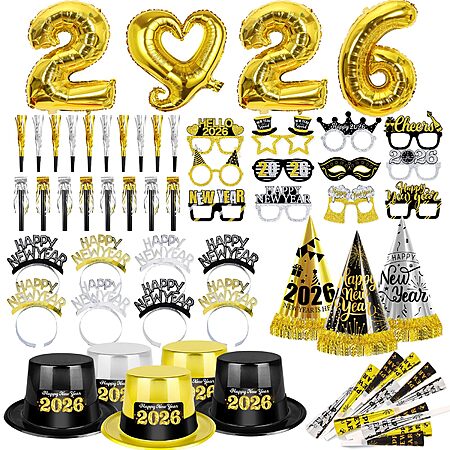 New Years Eve Party Supplies 2026, All-in-1 Party Favors with 2026 Balloons Noise Makers Top Hats Cone Hats Headbands Glasses New Years Decorations Photo Booth Props for Graduation Party Birthday. Free Shipping w/Prime or $35+.