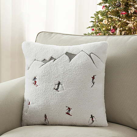 Features embroidered skiers on super-soft, white Sherpa fabric. Includes one 18 x 18-inch decorative pillow. Fabric details: 100% polyester sherpa with satin stitch embroidery. Generously stuffed with extra-soft filling. Festive holiday decorative pillow for your bed, couch, or favorite chair. Care instructions: Spot clean only. Each decorative pillow is sold separately.