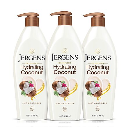 Jergens Hydrating Coconut Body Lotion, Hand and Body Moisturizer, Infused with Coconut Oil, Hydrates Dry Skin Instantly, Dermatologist Tested, 16.8 oz, Pack of 3 on sale for