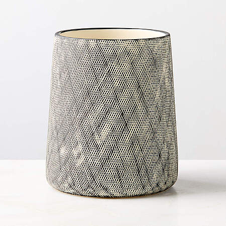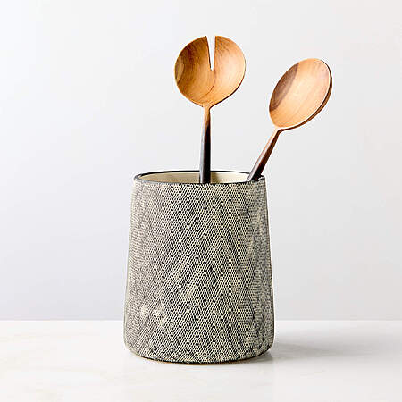 CB2 Kari White and Black Cross Hatch Utensil Holder. Stoneware utensil holder is a striking accent for the kitchen. Slip-cast and glazed by hand in matte black, the display-worthy stoneware vessel is crosshatched by hand for an organically textured surface. To complement the look, pair with the Kari oil cruet. CB2 exclusive.