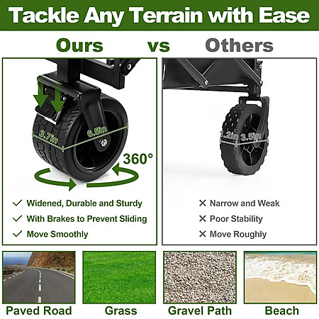 • Handles All Terrain with Ease: Equipped with 6.5-inch PVC all-terrain wheels, this wagon glides smoothly over any surface. The 360° swivel front wheels come with locking options, providing stability even on uneven ground.