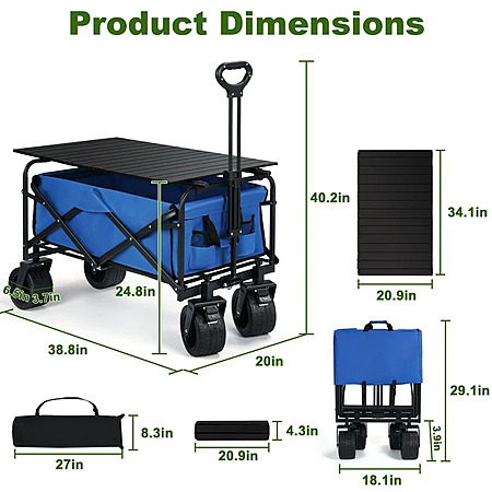 Package Includes: 2 Front Wheels, 2 Rear Wheels, 1 Wagon Frame, 1 Removable Cover, 1 Detachable Tabletop, 1 Wagon Storage Bag, 1 Tabletop Storage Bag