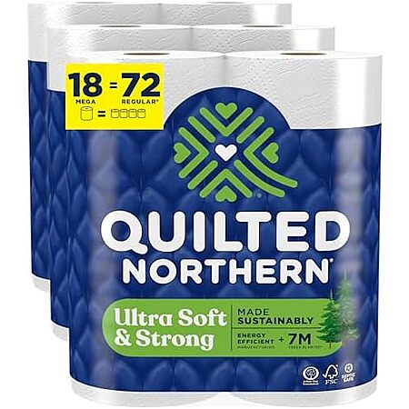 Amazon[amazon.com] has 18-Pack 295-Sheet Quilted Northern Toilet Paper Mega Rolls (Ultra Soft & Strong) 3 for $56.91 - 5% when you check out via Subscribe & Save = $54.06. Shipping is free with Prime or on $35+ orders.