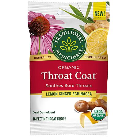 Traditional Medicinals Lozenges, Organic Throat Coat Lemon Ginger Echinacea, Sore Throat Support, 16 Count - Subscribe & Save $3.64