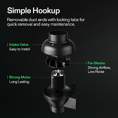 - Simple Hookup: The flanges on both the intake and exhaust ends are simple to assemble with the vent hose by locking tabs; A cord of 5.9-feet long for hassle-free setup; The housing, even the impeller and blades, are easy to detach for cleaning and maintenance