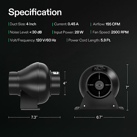 - Powerful Airflow: This powerful blower with a fan speed of 2500 RPM can create an airflow of 195 CFM; It works efficiently in ventilating grow tents, transferring heat or cool rooms, circulating fresh air, as well as controlling proper humidity, temperature, and air quality for your grow area