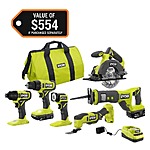 | Product Description: | RYOBI introduces the 18V ONE+ 6-Tool Combo Kit with 1/2 in. Drill/Driver, 1/4 in. Impact Driver, Reciprocating Saw, 5-1/2 in. Circular Saw, Multi-Tool, LED Light, Batteries, Charger, and Bag. The Drill/Driver provides up to 515 in./lbs. of torque and features a 1/2 in. ratcheting metal chuck to match your drilling and driving needs. The Impact Driver is able to drive long deck screws or large lag screws with ease by delivering 3,400 IPM along with 1800 in./lbs. of torque controlled by a variable-speed trigger that churns out 2,700 RPM. The Reciprocating Saw delivers better productivity with up to 3,400 SPM and 60% faster cutting. The 5-1/2 in. Circular Saw has the ability to cut through 2-by material, with over 215 cuts per charge. The Multi-Tool features an adjustable speed dial giving the ability to make cuts into drywall, metal, wood, plastic, composite and other materials, along with the ability to sand the finest details. The LED Light also has 280 Lumens of light output and has a 130° pivoting head. The included Batteries and Charger are compatible with RYOBI ONE+ Tools. Best of all, this kit is part of the RYOBI ONE+ System of over 300 Cordless Products that all work on the same battery platform. Backed by the RYOBI 3-Year Manufacturer's Warranty, this Kit includes a Drill/Driver, an Impact Driver, a Circular Saw, a Reciprocating Saw, a Multi-Tool, an LED Light, a 4.0 Ah Battery, a 1.5 Ah Battery, Charger, Bag, and Operator’s Manuals. |