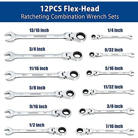 Model: SORAKO Ratcheting Wrench Set Flex Head, 12 Piece SAE Combination Ratchet Wrench kit, 1/4″ - 13/16″ Chrome Vanadium Steel Wrenches