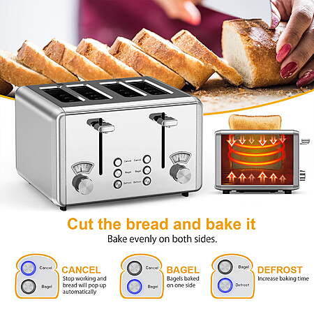| Product Description: | WHALL 4 Slice Toaster Stainless Steel, Toaster-6 Bread Shade Settings, Bagel/Defrost/Cancel Function with Dual Control Panels, Extra Wide Slots, Removable Crumb Tray, for Various Bread Types 1500W Specifications Material: Stainless Steel Item Size: 13.98 x 13.58 x 7.48 In Item Weight: 5.78 Lbs. Rating Voltage: 120V~ 60Hz Rating Power: 1500W Item Conditionï¼New Key Features 1.4 slices toaster 2.1.5-inch Wide Bread Slot 3.Removable Crumb Tray 4.Bagel/Defrost/Cancel Function 5.6 Bread Shade Settings 6.Self-Adjusting Bread Carriage Note This product is designed to bake multiple slices of bread at the same time, if you only bake a piece of bread, please use first level to avoid burned. Before first use, preheat the toaster according to the tips in the manual. Warranty & Service Our products come with one-year-free warranty. If any issues, please contact our customer service team, we will reply you within 24 hours. This WHALL 4-slice toaster is made of durable stainless-steel material, ensuring long-lasting and safe high-temperature baking. The internal bidirectional surround heating technology evenly heats the bread, preventing unevenness and producing a uniform, golden color in just 2 minutes. Customize your toast shade from lightly golden to deep dark with the 6 shade settings, allowing you to choose your preferred level from 1 (light) to 6 (dark). The toaster features 1.5-inch-wide slots, perfect for various types of bread, including waffles and thick artisanal bread. With 4 slots and 2 independent control panels, you can toast different preferences simultaneously, saving time for a quick and satisfying breakfast. The removable crumb tray collects bread crumbs, making it easy to clean after each use. The toaster offers three basic functions: Defrost, Bagel, and Cancel, providing you with the flexibility to toast your bread just the way you like it. The solid high lift lever lifts food 1 cm higher than usual, making it easier to remove smaller bread. |