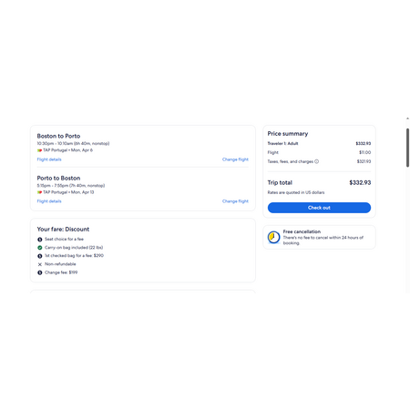 TAP Air Portugal and Expedia have round trip airfares travelling from Boston (BOS) to Porto Portugal (OPO) for $333, nonstop. These are basic economy fares that will include a personal item and a carry-on bag. There is no seat selection and no change.