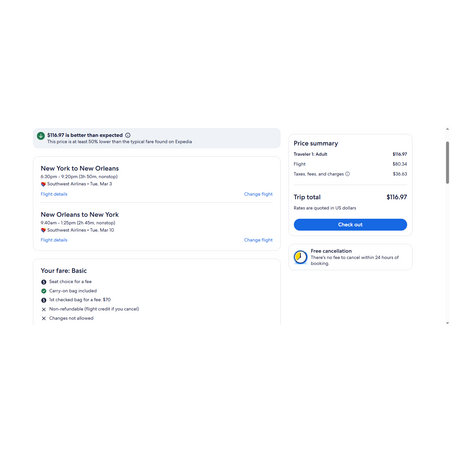 JetBlue and Southwest Airlines have round trip airfares travelling to and from New York (LGA or JFK) and New Orleans (MSY) for $117, nonstop. These are basic economy fares that allow a personal item and a carry-on bag. There is no seat selection and no change.