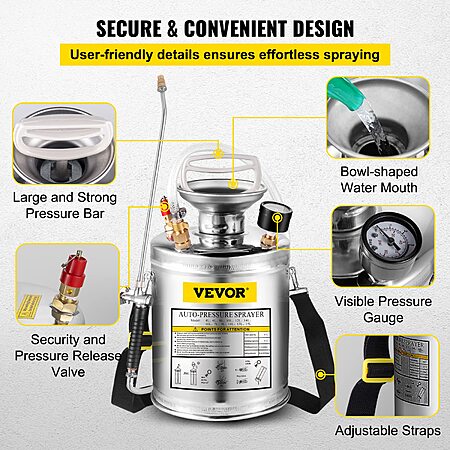 - Durable Stainless Steel – 1‑gallon capacity, 1.5–4.0 bar pressure; rust-proof and long-lasting. Not suitable for strong corrosive, acidic, or basic solutions due to rubber ring and internal design.