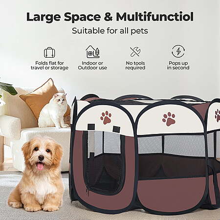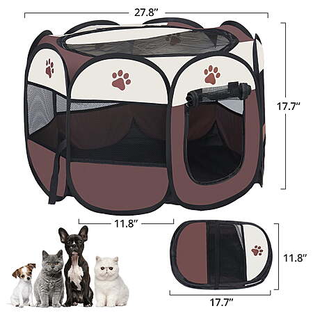 | Product Description: | 😸Light-weight portable pet playpen allows pets to play in a contained area; features removable top, 360 open-mesh view, and zippered side entrance.Easy-open pop-up assembly and ground stakes for a safe, secure play area.Playpen folds back easily into the included carry bag. Used both indoors and outdoors.Great for travel, camping, trips to the park,relaxing indoors,house training,exercise, etc. 😸Product Introduction: Material: Nylon Oxford With PVC Coating Dimensions: 27.8in (L) x 27.8in (W) x 17.7in (H) ✔1 x Pet Fence ✔8-Panel Mesh Cat Playpen ✔2 Zippered Doors ✔1 Top and 1 Side 📗Description: 【Pet friendly and safe】8 side panels form a circular shape, puppy play pen is composed of high-grade thick mesh and scratch resistant oxford cloth. These pet playpens feature 360 degree view of sunview, designed with spacious interior, well-ventilated, mesh roof to make sure that your pet doesn't feel anxious. 【Easy to use】The pet playpen on the side of this pet pen can be easily rolled up and pasted, making it easy for your pet to get in and out of the pet pen. Close the door and keep your pet safely inside. The detachable semi-mesh zipper top can be easily removed for indoor use and closed for outdoor use to provide shade. Make sure your pet is comfortable in any environment. 【Pop up playpen】No assembly required, sets up in seconds and requires no assembly folds flat when not in use for easy carrying and storing. Dog playpens for the house on hardwood floors, foldable pet playpen lightweight yet strong, can be used indoors or outdoor, camping. The portable design makes it a perfect choice for travel bulky and heavy crates are a thing of the past. 【The dog pen tent is easy to clean】 simply wipe off any dirt or wash it with water, then let it air dry and continue to use. You can also put a blanket under the fence and wash it if it gets dirty. 【Easy and fun】 enclosure pup tent, the spacious interior gives your pet room to play or sleep. Breathable material make pet so comfortable , you can put a mat/blanket in the playpen, keep your pet comfortable. |