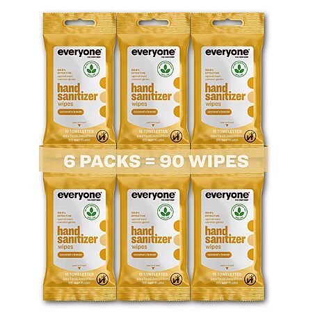 Everyone Hand Sanitizer Wipes, 15 Wipes (Pack of 6), Coconut and Lemon, Made with Sugarcane Derived Alcohol with Essential Oils, for $15