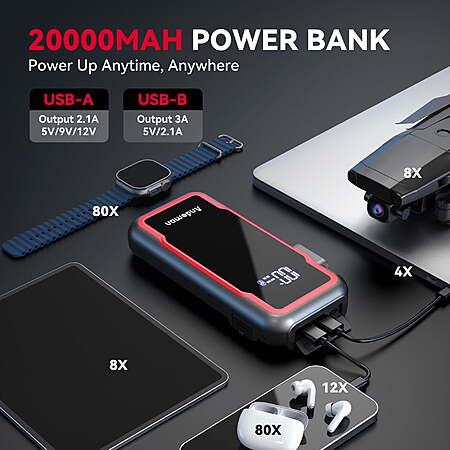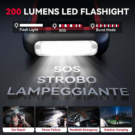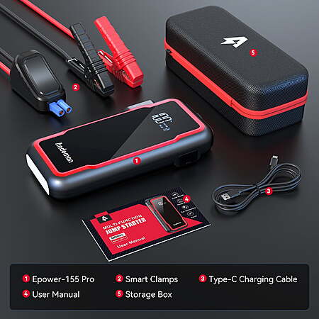 | Product Description: | With 3000A Peak & 20000mAh Capacity\nWith 3 Modes LED Light (High, Strobe &SOS)\nA Battery Booster but also a Powerpack with 20000mAh Capacity Type-C and Dual USB Ports\nPortable & Compact Never get stranded on road again. No need to wait for other people to help you or call for towing service.Get this and jump start your dead car battery in seconds. Equipped with a high-speed polymer battery instead of a normal starter.With the super 3000A peak and 20000mAh capacity, it is easy to start a 12V vehicle (9L gas engine or up to 7L diesel engine), or even RV, motorcycle, tractor, lawnmower, speedboat up to 80 times.No need to recharge the jump starter often. The Car battery jump starter with 3 lighting modes which represents stable, strobe and SOS, it can be used as a torch, life-saving signal light, and traffic warning light.Whether you need light to change a tire, inspect an engine, or need to warn oncoming traffic that you are broken down on the side of the road, the ultra-bright LED flashlight will have you covered. The unit is supplied in a high-quality durable case.Unlike traditional bulky jump starter packs, it's small enough to store in your glovebox and light enough to carry around. Emergency jump starter + Portable charger + LED stable flashlight + S.O.S lighting signal for help + Dual USB quick charge + Cigarette lighter.It can help you in any case whether you are in an emergency or in daily life, High or low temperature.Dual USB outputs(5V/2A and 5V/3A) fast charging your mobiles/computer/camera and so on. Brand: Audew (Andeman) Model: Epower-155 Pro Item Weight: 2.42 pounds Product Dimensions: 8.46 x 4.33 x 3.93 inches Peak Current: 3000A Capacity: 20000mAh LED Light: Flashlight/Strobe/SOS Input: Type-C fast charge 5V/3A Output: Dual USB A (5V/9V/12V 2A); Dual USB B fast charge(5V/3A) Color: Red 1x Battery Jump Starter 1x Intelligent Clamps 1x Type-C Charging Cable 1x User Manual Storage Box |