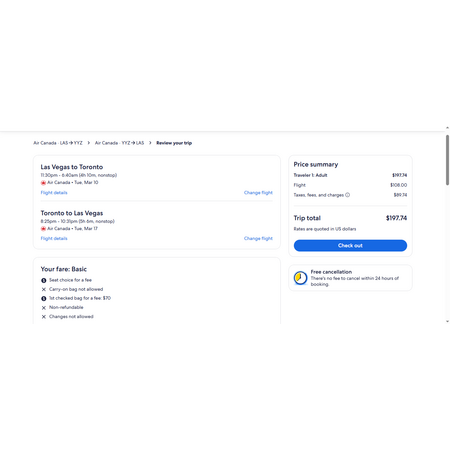 Air Canada and Expedia have round trip airfares travelling from Las Vegas (LAS) to Toronto Canada (YYZ) for $198 nonstop. These are basic economy fares and allow a personal item that fits under the seat in front of you only. There is no seat selection, no carry-on bag and no change.