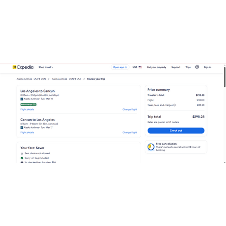 Alaska Airlines and Expedia have round trip airfares travelling from Los Angeles (LAX) to Cancun Mexico (CUN) for $299, nonstop. These are basic economy fares that allow a personal item and a carry-on bag. There is no seat selection and no change. If you are travelling with children, you will be seated together as per Alaska's policy.